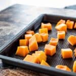 ⭐️Prepare the squash. Place the diced butternut squash onto the baking sheet in one layer, making sure the pieces don't touch.